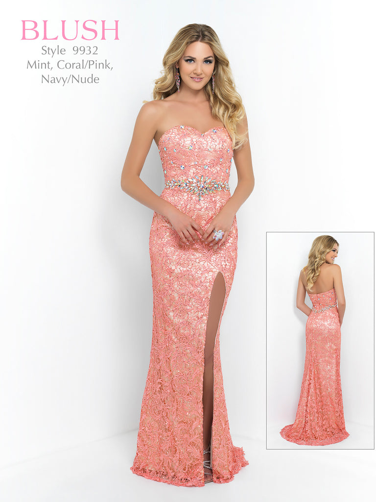 Dress to impress in this stunning floral lace gown featuring a moderate sweetheart neckline and column silhouette that hugs your natural curves giving you that sexy hourglass look. The bust is slightly beaded with large AB stones while the waist is belted with a cluster of AB stones and crystal beading. The thigh high slit and brush train complete this sophisticated look.