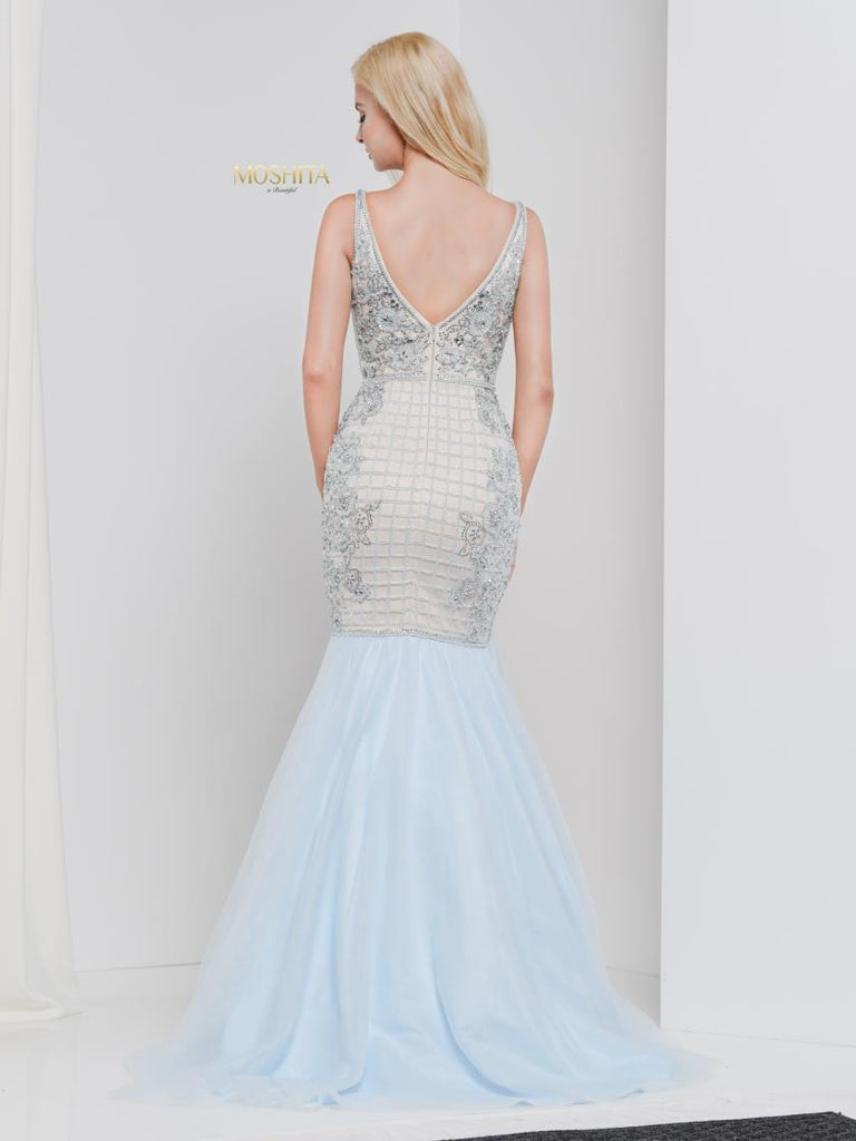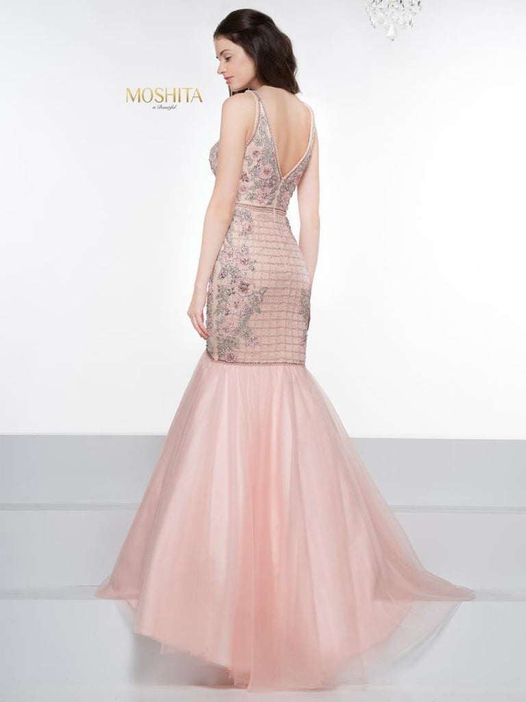 A stunning fishtail gown with a netted skirt and fully embellished bodice, with criss-cross details and floral design.