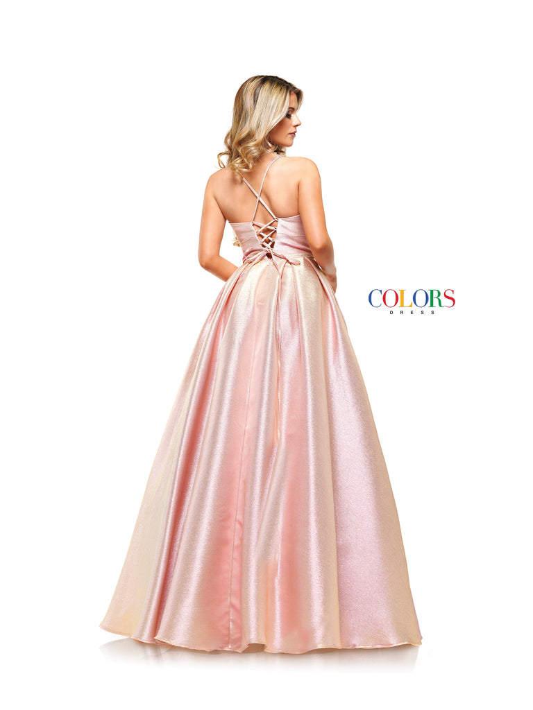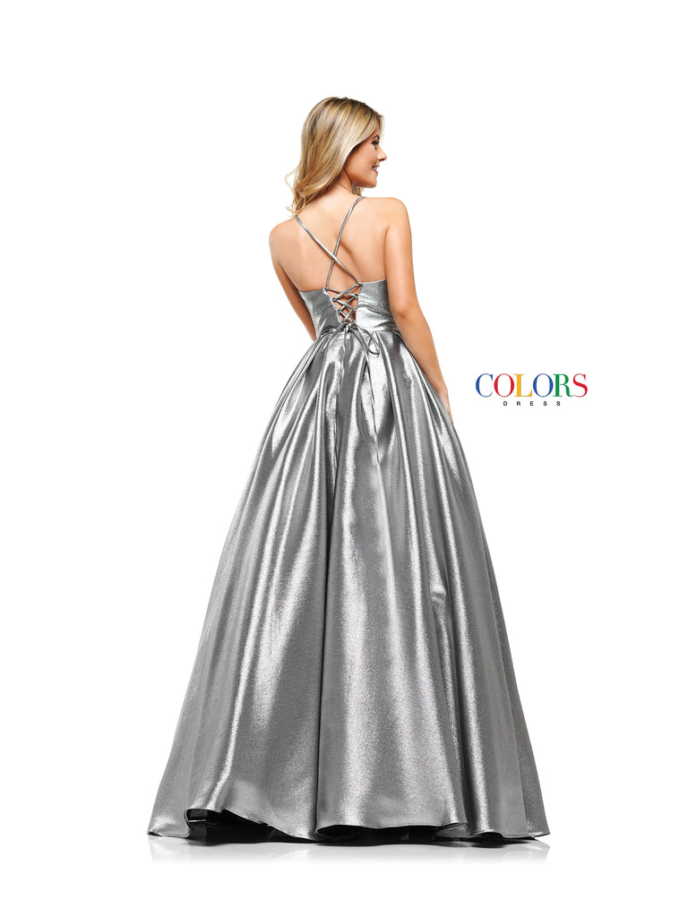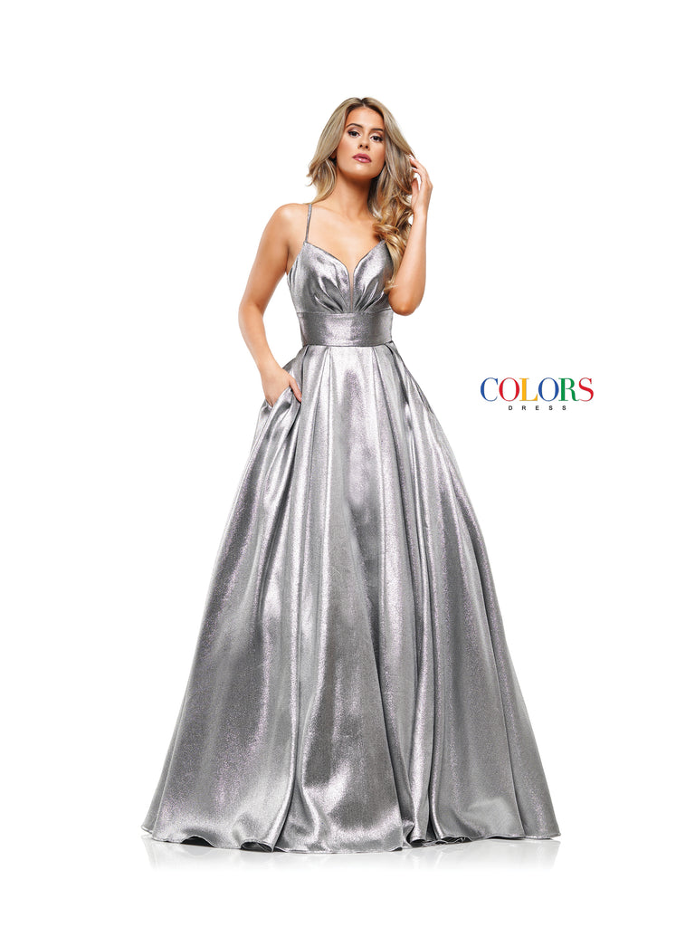 This gown is made of a beautiful two tone metallic fabric and features hidden pockets. Simple yet effective!