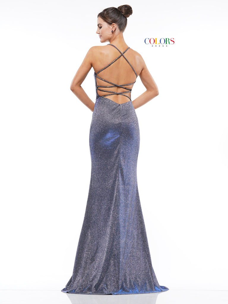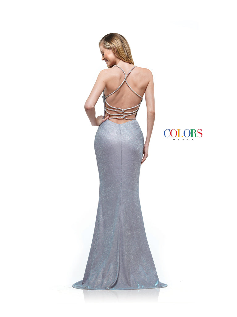 This slinky gown features a backless design with beaded strap detail and a thigh high leg split. Made from the most beautiful glitter fabric this dress is sure to get you on the best dressed list!