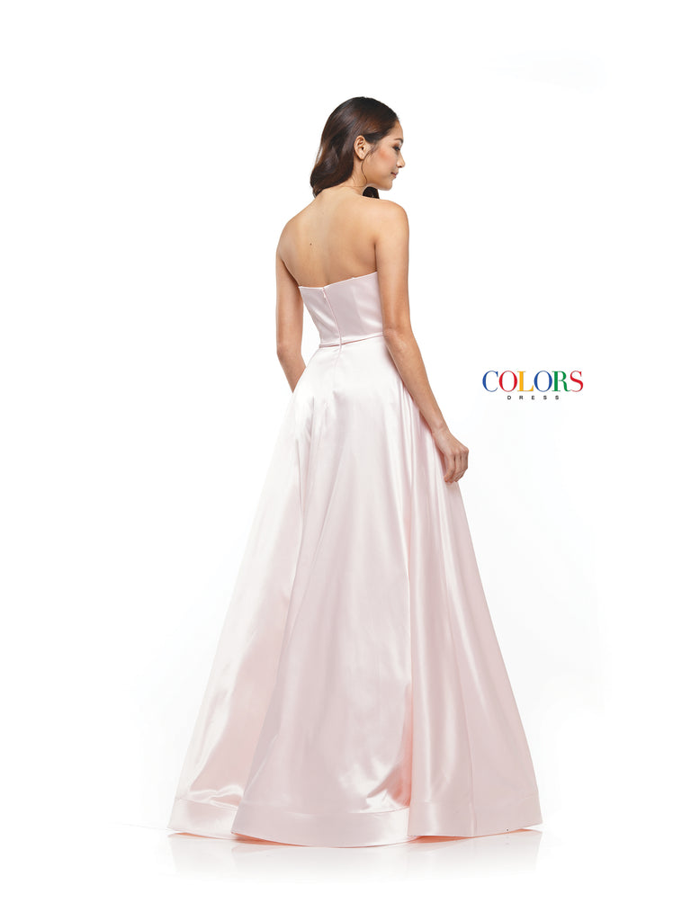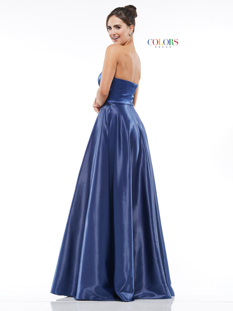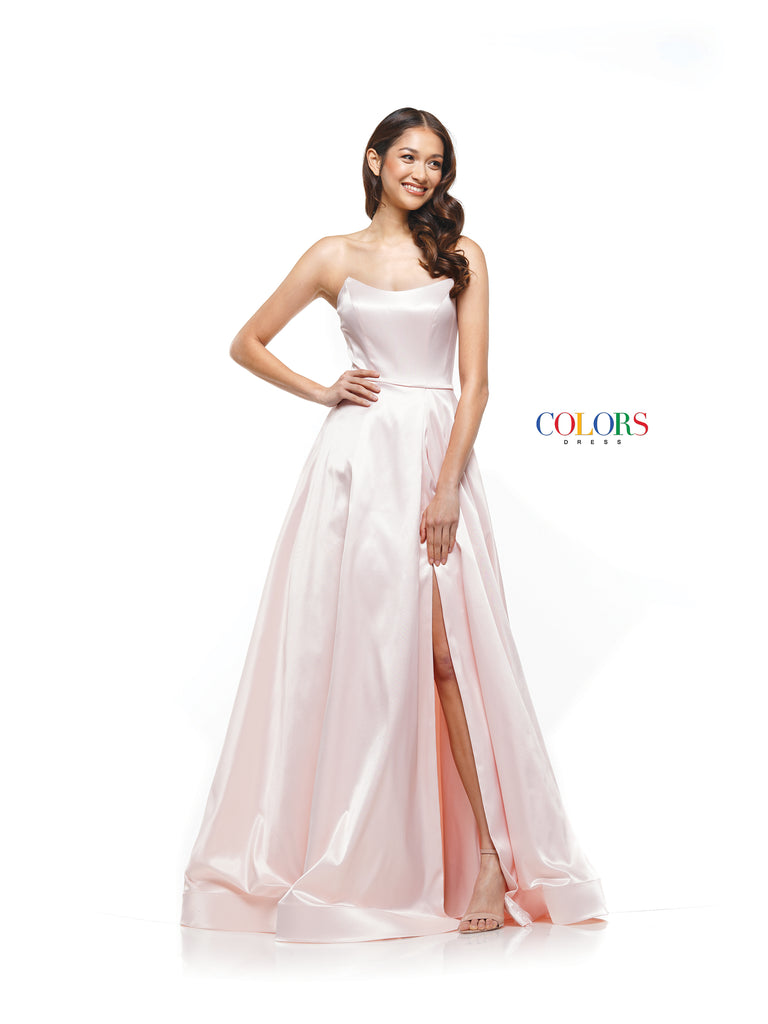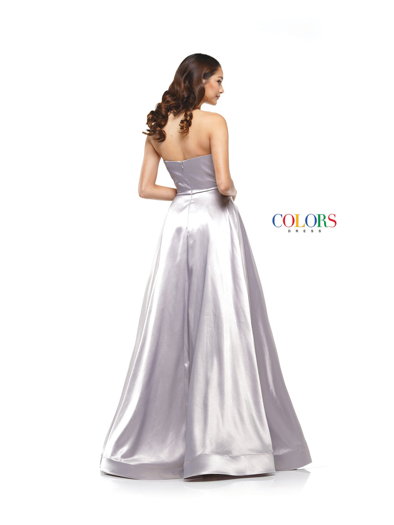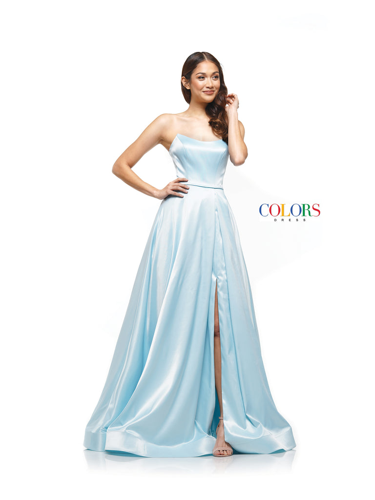 A stunning satin strapless ballgown that is perfect for any formal event. This dress has hidden pockets and a slight leg split.
