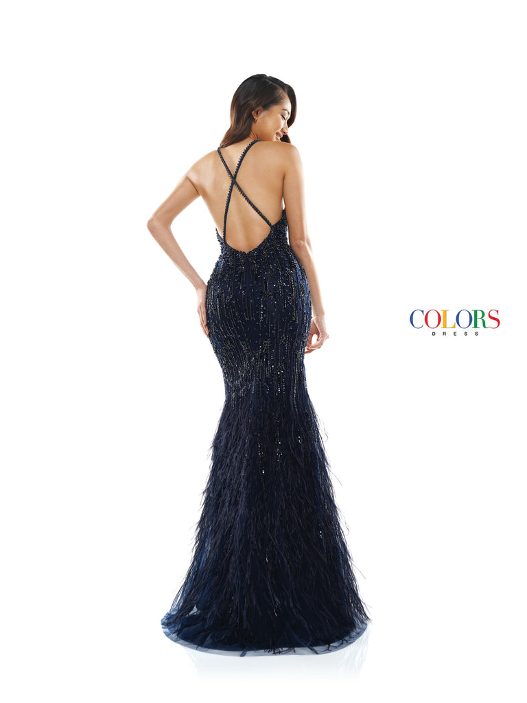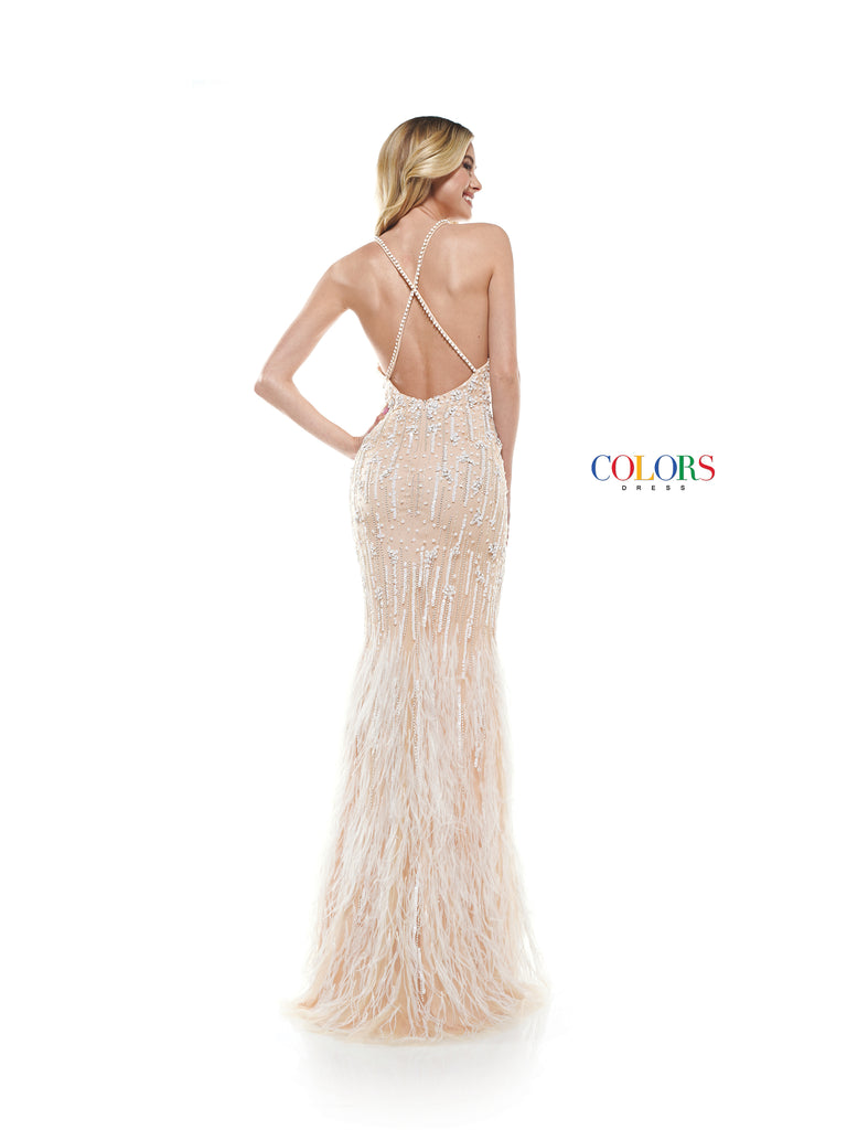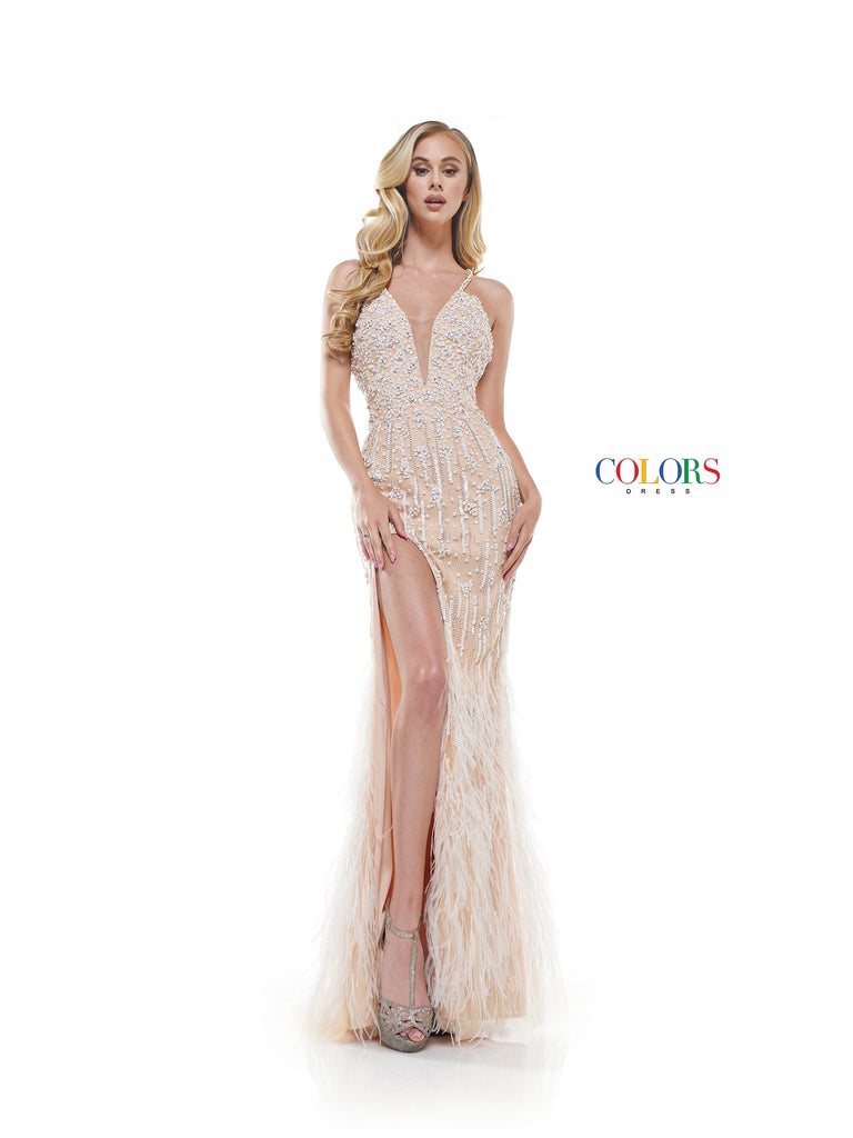 A heavily embellished gown with beautiful lightweight feathers adorning the skirt. Perfect for pageants or standing out at prom!