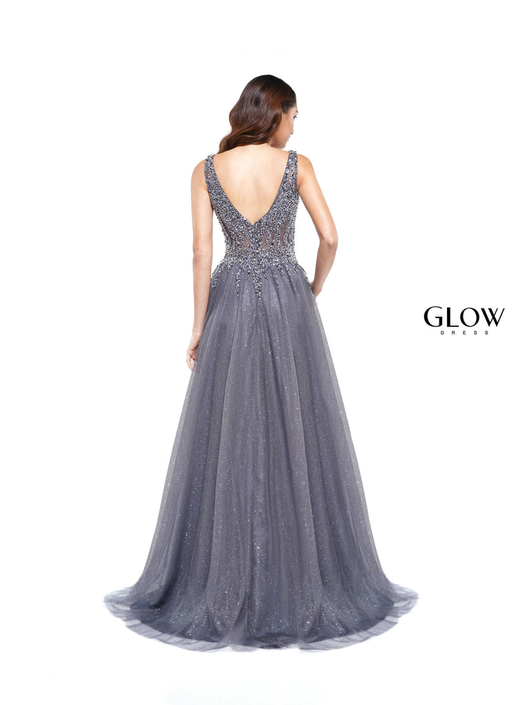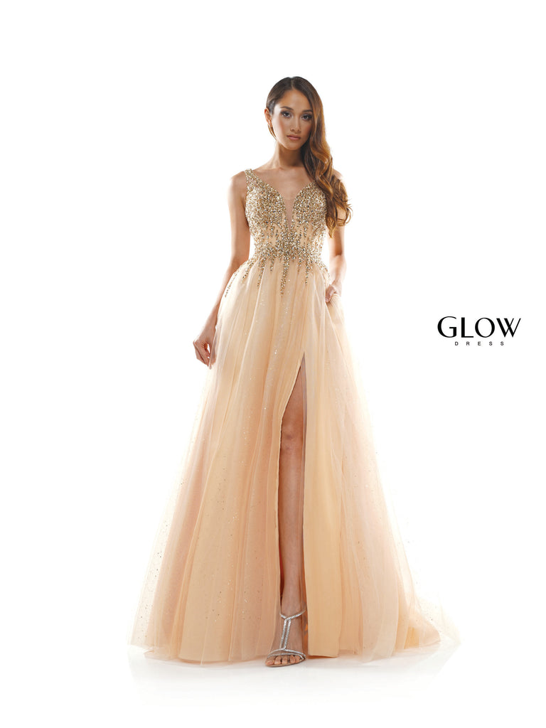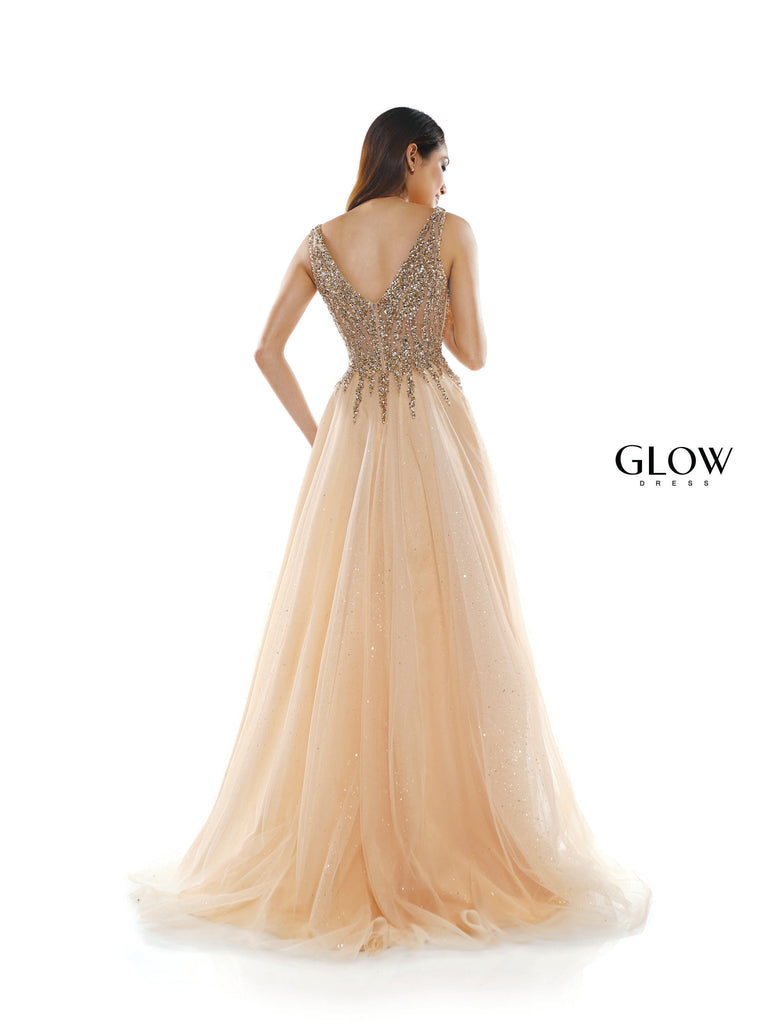 This dress features a fully embellished bodice with a stunning neckline, and a glitter tulle skirt. Perfect for prom and it even has pockets!