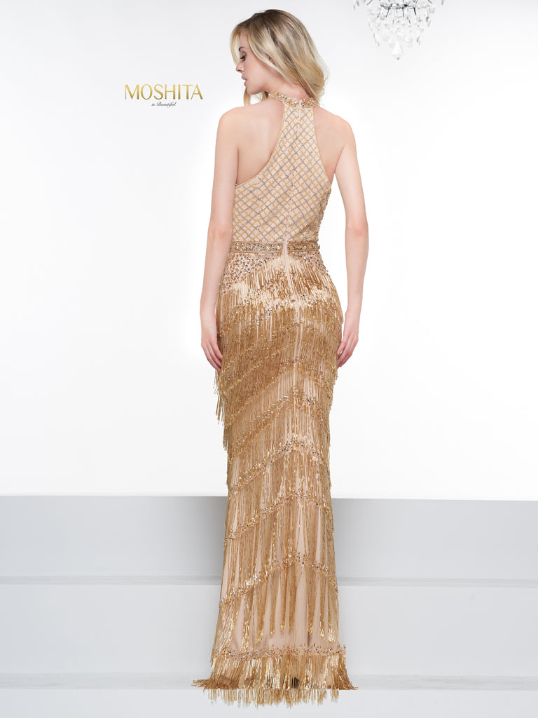 This dress is sure to have everyone speechless at your prom or pageant! This stunning couture inspired gown has a full beaded fringe skirt and embellished bodice.