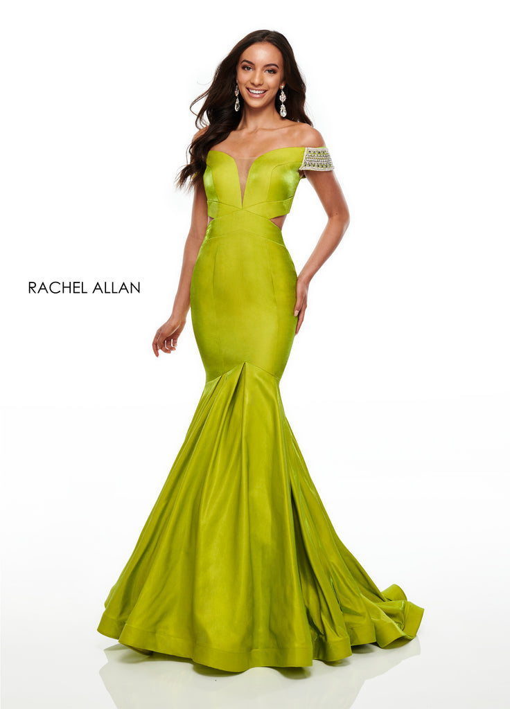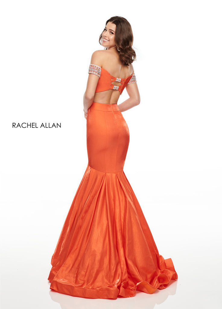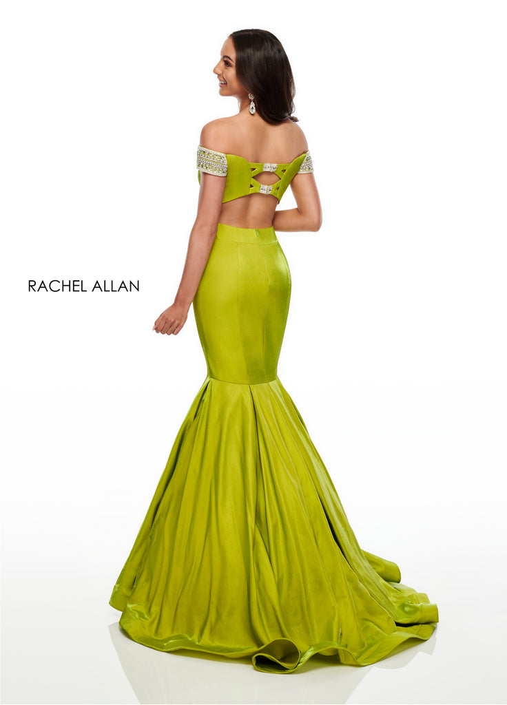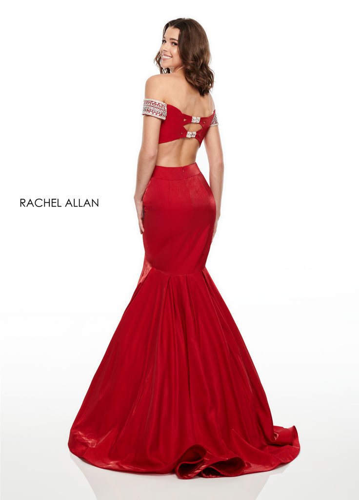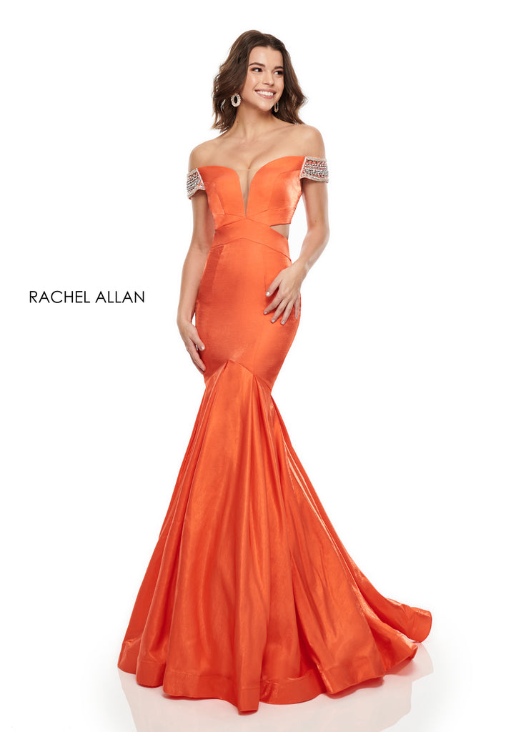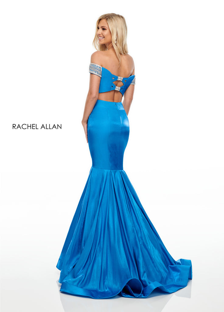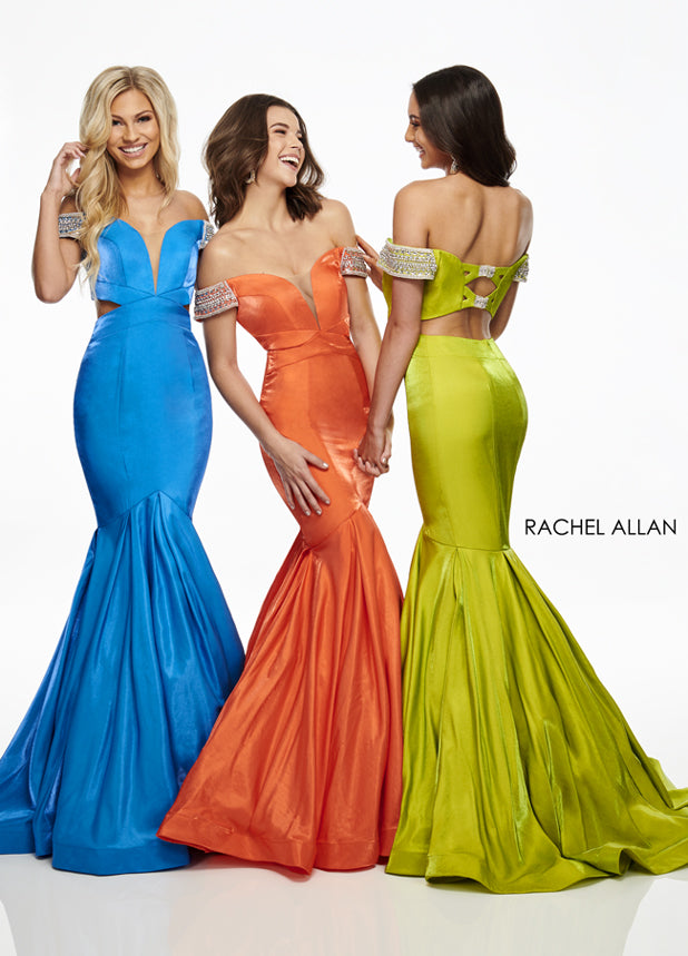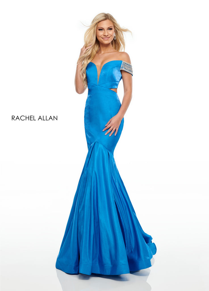 Elegant and timeless, this Rachel Allan fishtail gown is perfect for prom or even pageants. This dress is made of luxurious satin fabric, features off the shoulder straps with beautiful beading and an open back. Prom perfect!