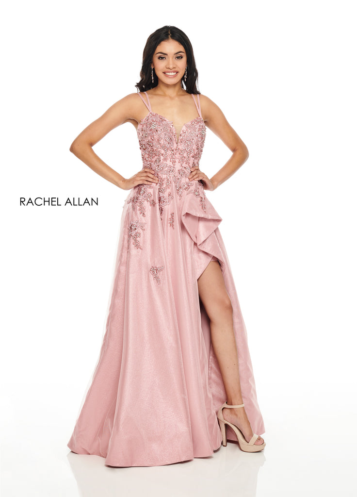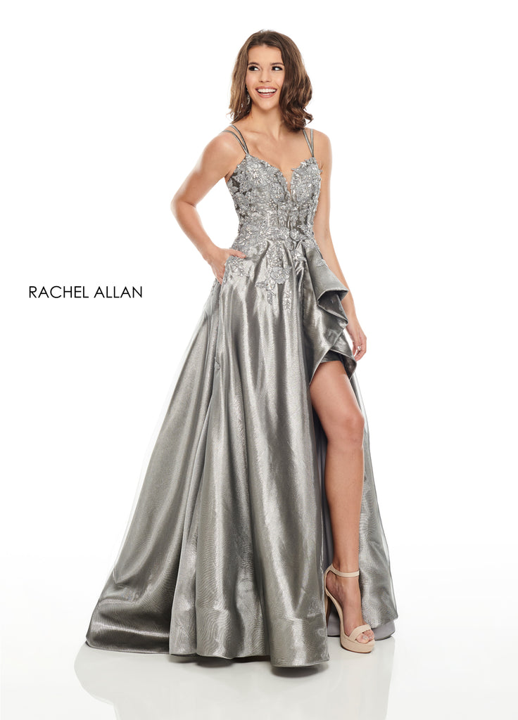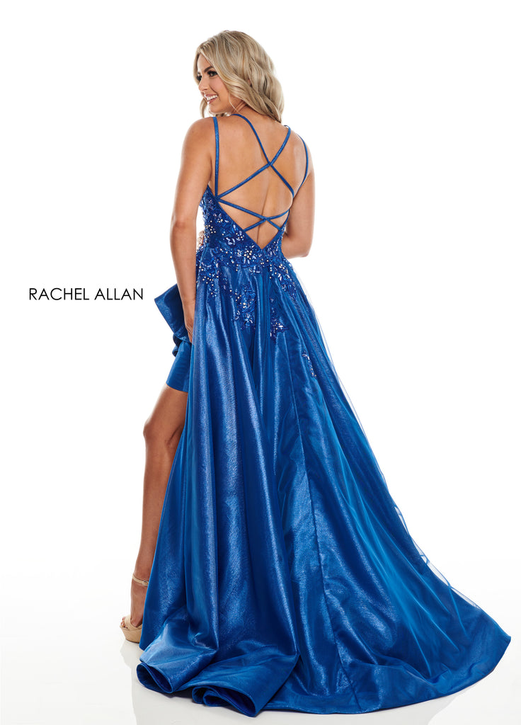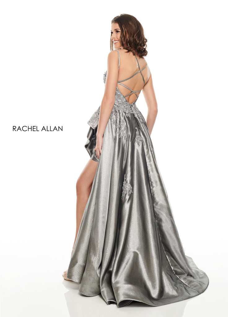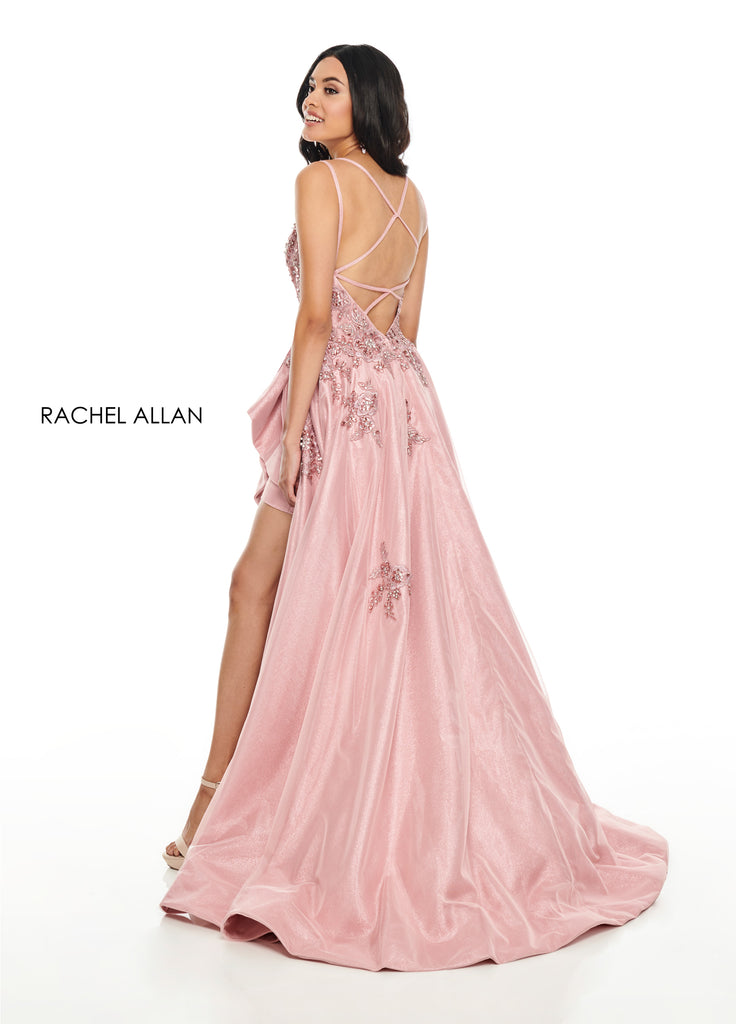This high low gown is perfect for making a statement at prom or standing out in pageant fashion wear! This Rachel Allan features a beaded bodice, a high leg split and hidden mini skirt as well as a strappy open back. Wow!