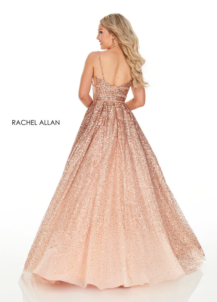 A glittering princess ballgown by Rachel Allan. This gown dazzles in every light with its ombre effect sequin skirt. It features illusion side panels to take this gown from beautiful to insane!