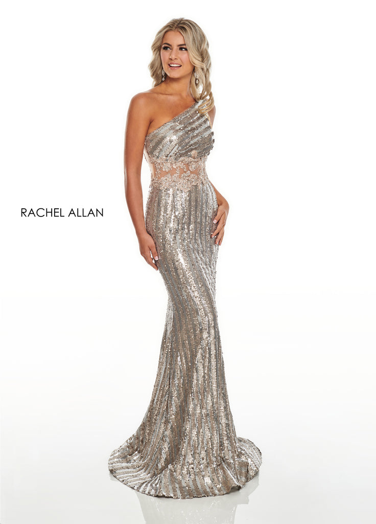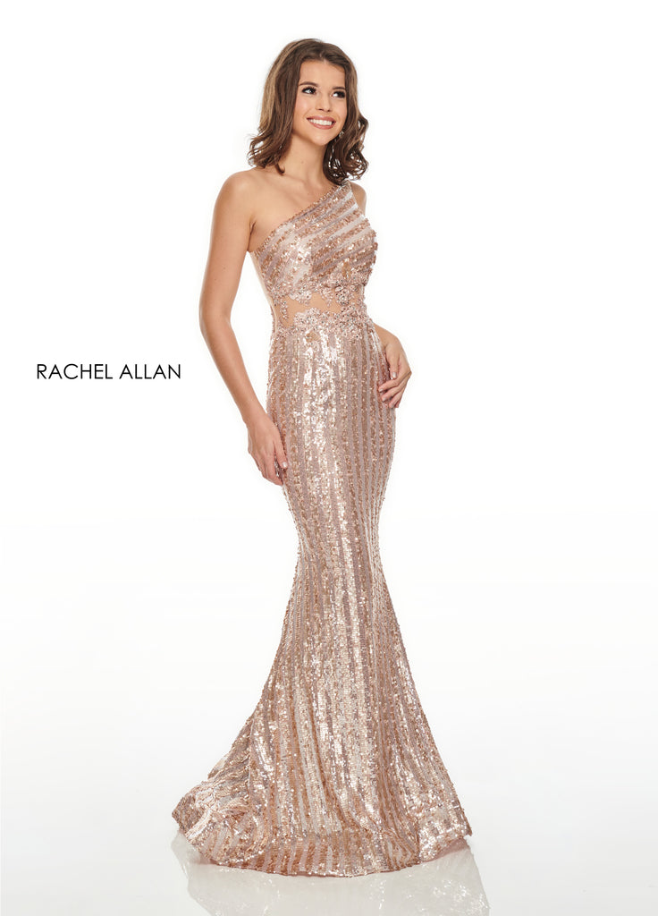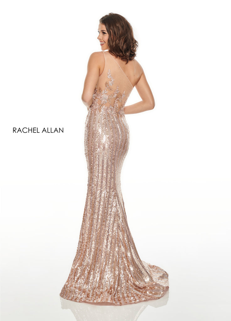 This slinky sequin Rachel Allan gown features an amazing illusion back and waist with gorgeous beading. Perfect for bringing glitz and glam to your event!