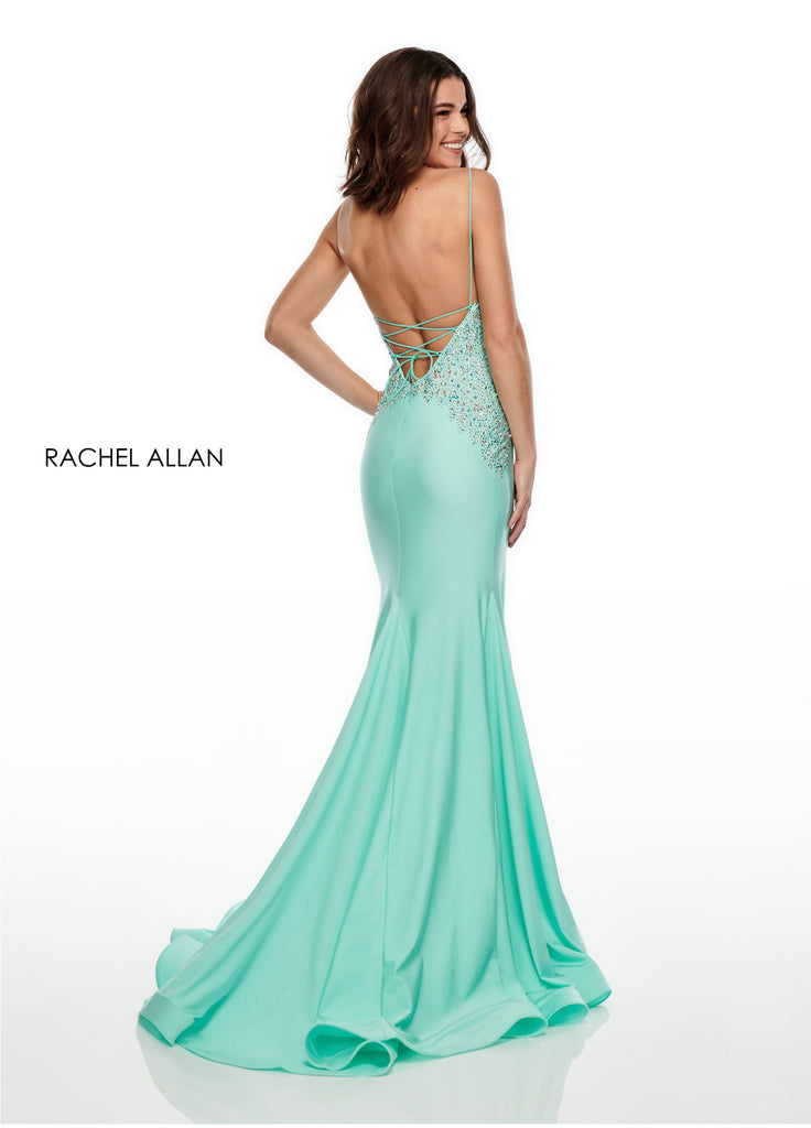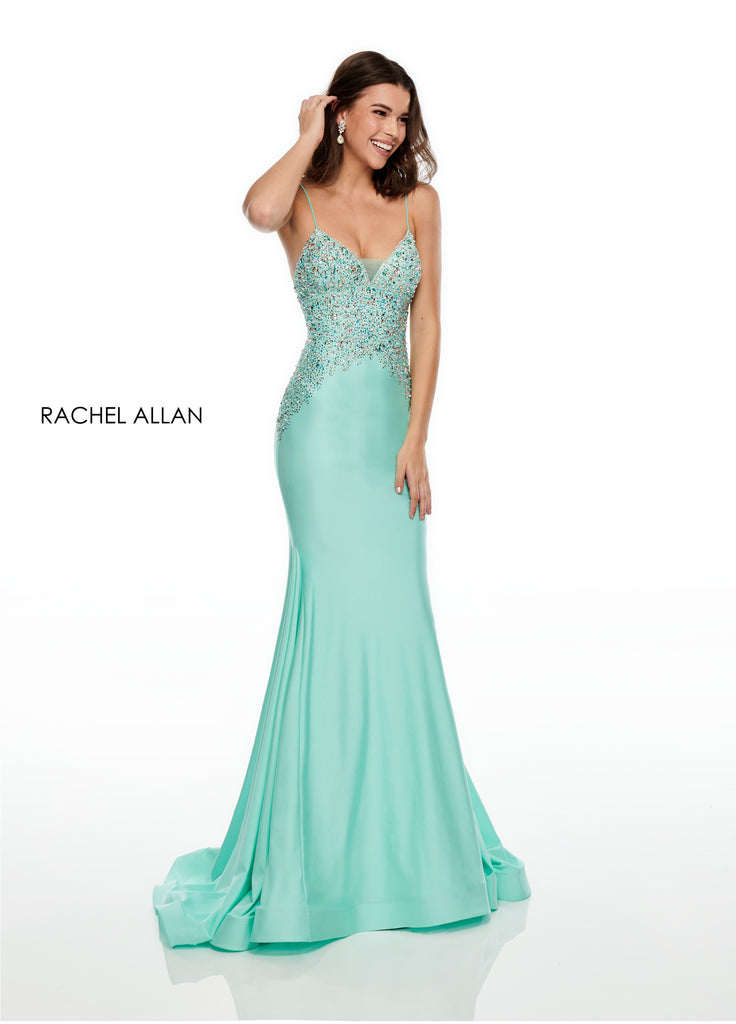 An elegant jersey gown with beaded bodice detail. It features a low strappy back and a thick hem to hold its stunning shape.