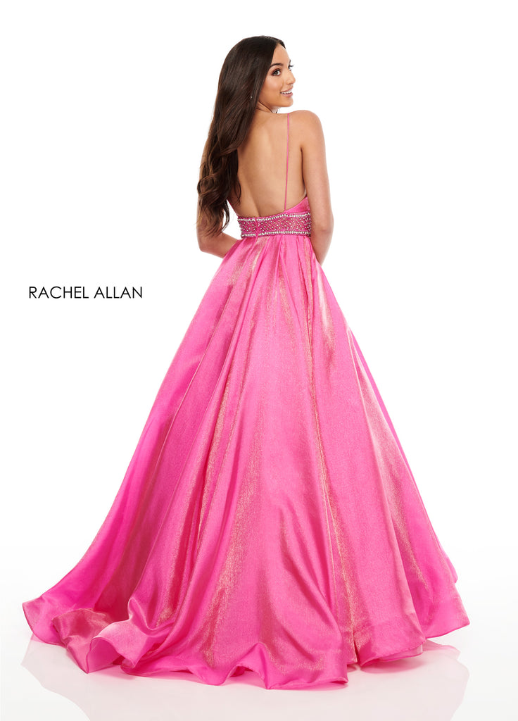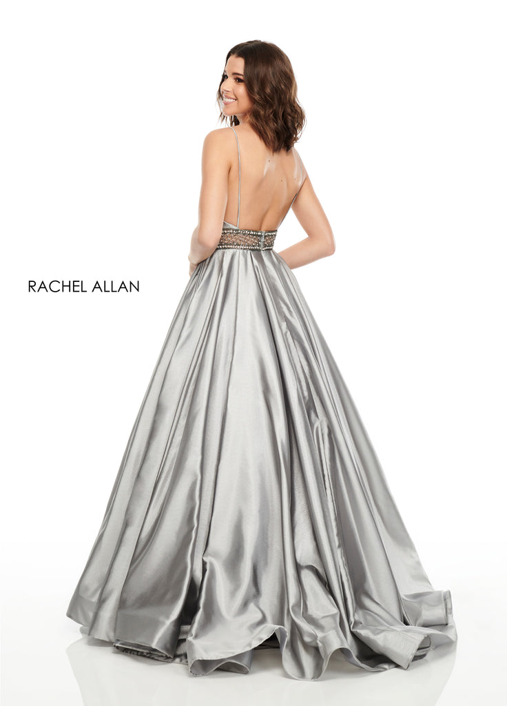 This simple yet stunning Rachel Allan gown features beaded detailing on the waist and a full ballgown skirt with hidden pockets.