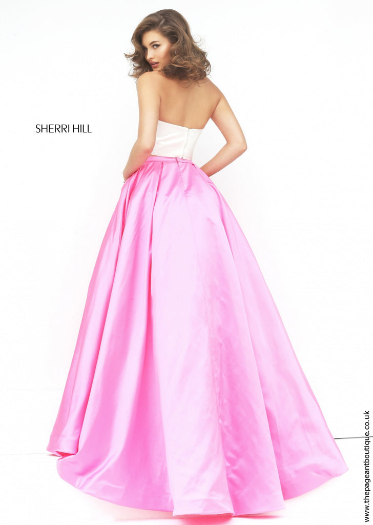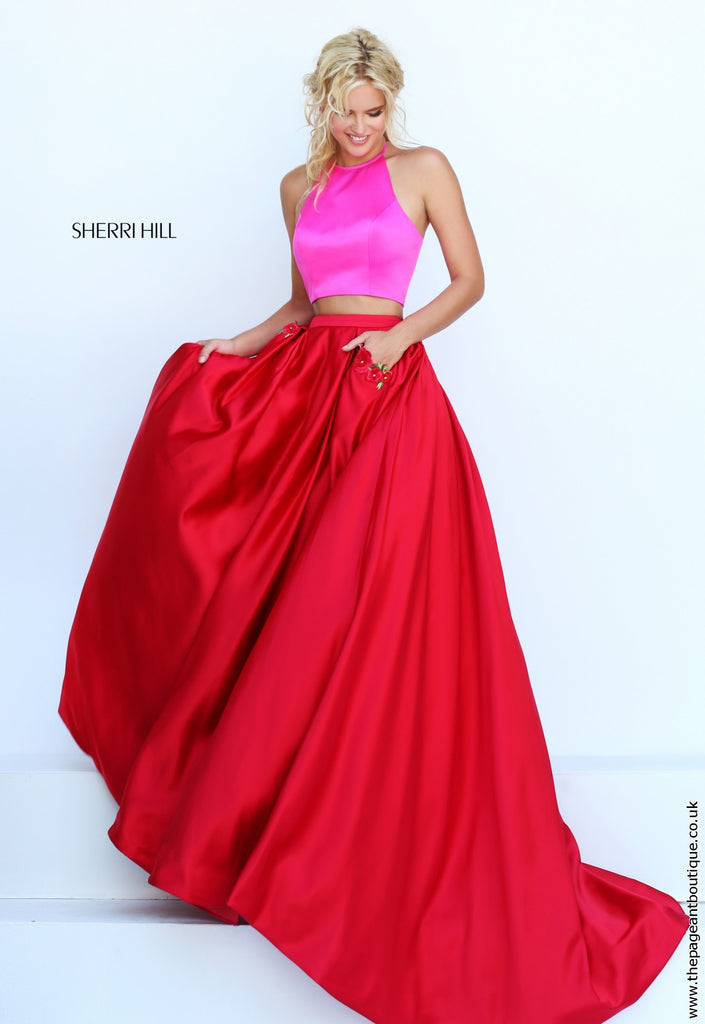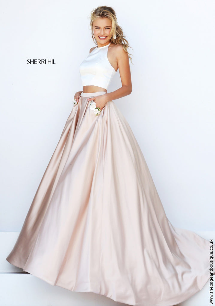 This two piece ballgown by Sherri Hill has intricate embroidered flowers on it's pockets, a full silky ballgown skirt and a pretty halterneck top.