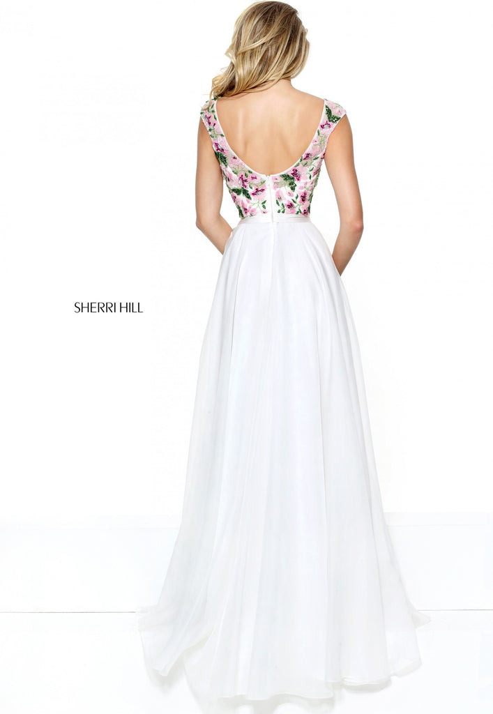 This Sherri Hill gown is perfect for summer proms, or even for a bride who wants an alternative wedding dress! featuring an ivory flowing skirt and a floral beaded high neck top this dress is sure to sparkle and wow!