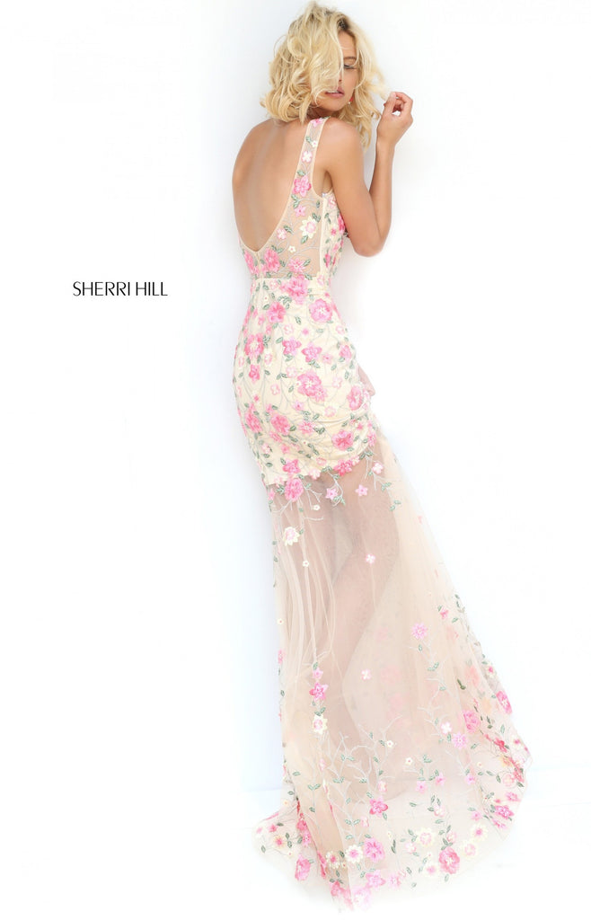 Perfect for summer, this floral Sherri Hill is flirty and fun! Featuring floral embroidery and a sheer skirt to show off those pins!