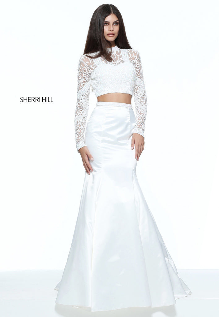 This stunning two piece fishtail from Sherri Hill is definitely red carpet ready! The top is fully embellished with a cut out back, high neck and long sleeves. It's paired with a full fishtail skirt with an embellished waist line. Stunning!