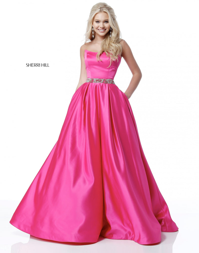 A stand out gown! This ballgown features a strapless bodice sculpted perfectly to enhance every figure, a beaded waist band and a full ballgown skirt. Hidden pockets finish this gown off and are perfect for hiding your phone and lipstick!