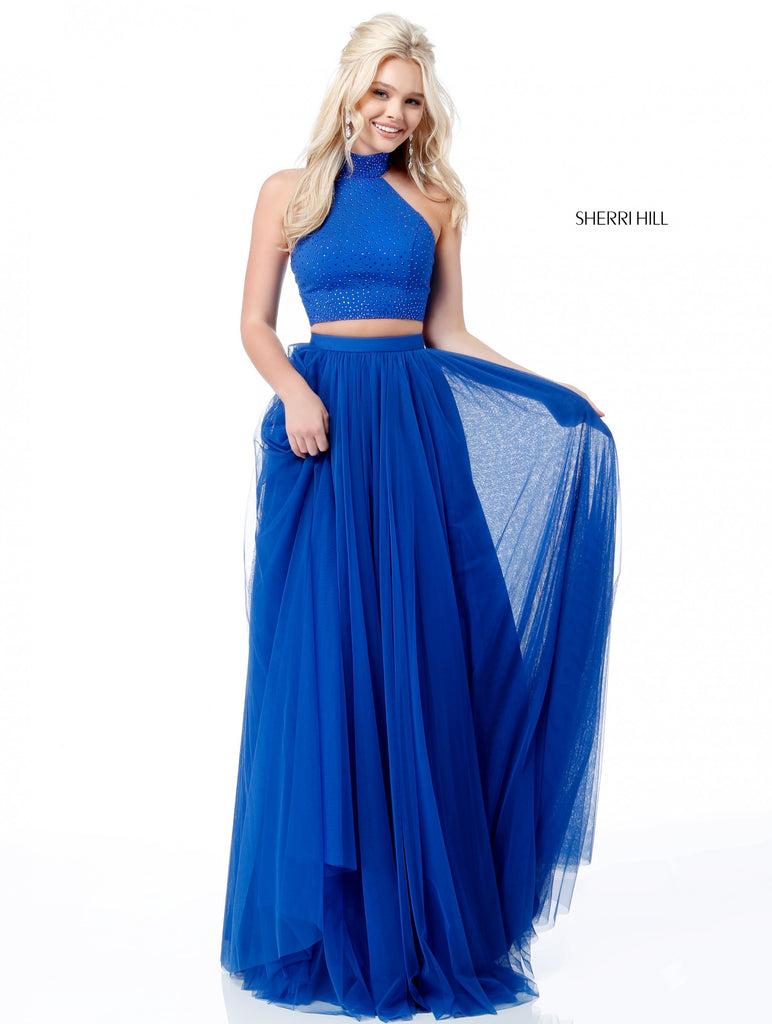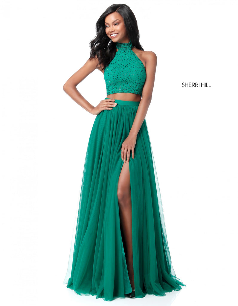 This two piece gown features a netted skirt with a cheeky leg split and a crystal embellished halterneck top. Perfect for standing out from the crowd!