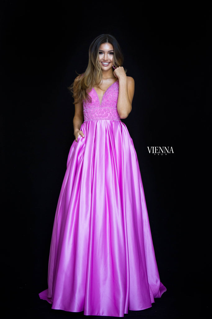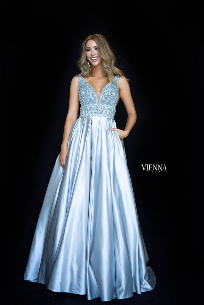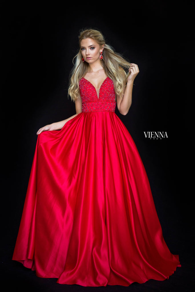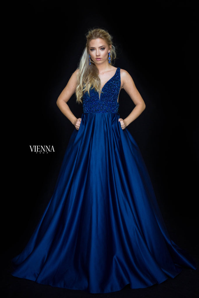 A stunning crystal beaded bodice with a full pleated ballgown skirt. This gown by Vienna Prom sparkles beautifully and comes in an array of gorgeous colours!