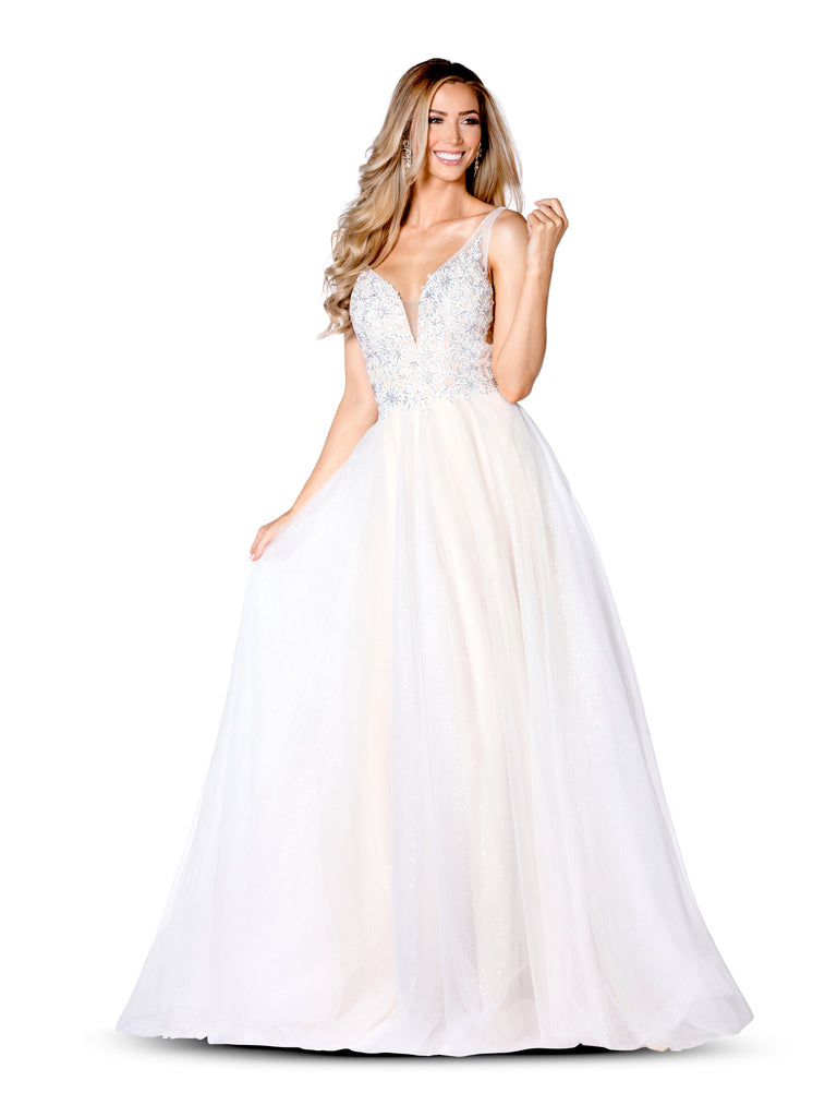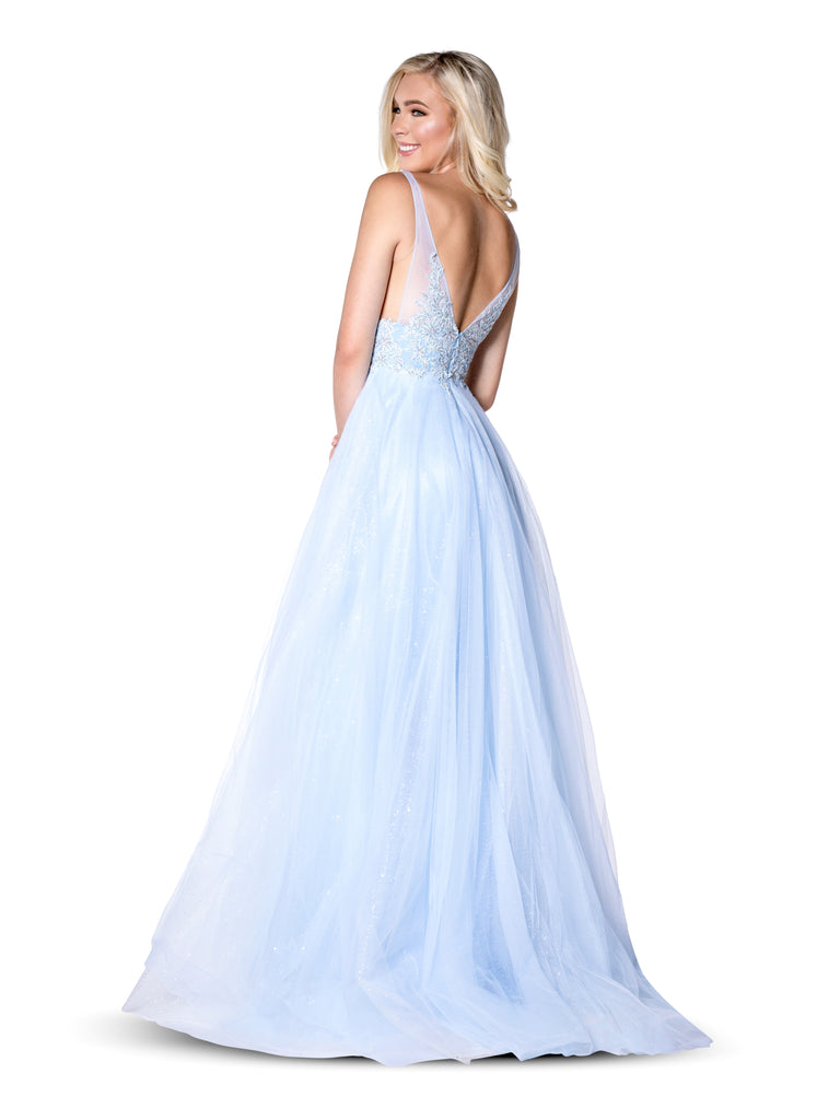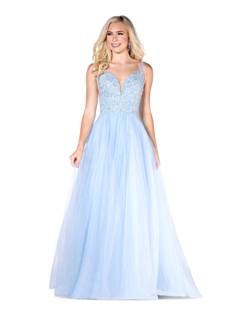A floating A-line dress with a sparkle tulle skirt and an embellished lace bodice. Perfect for summer!
