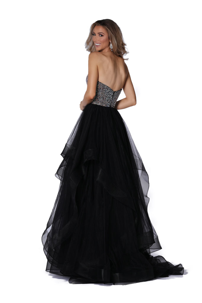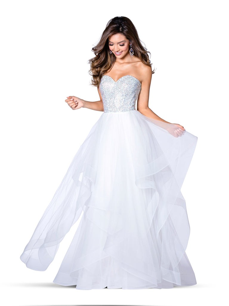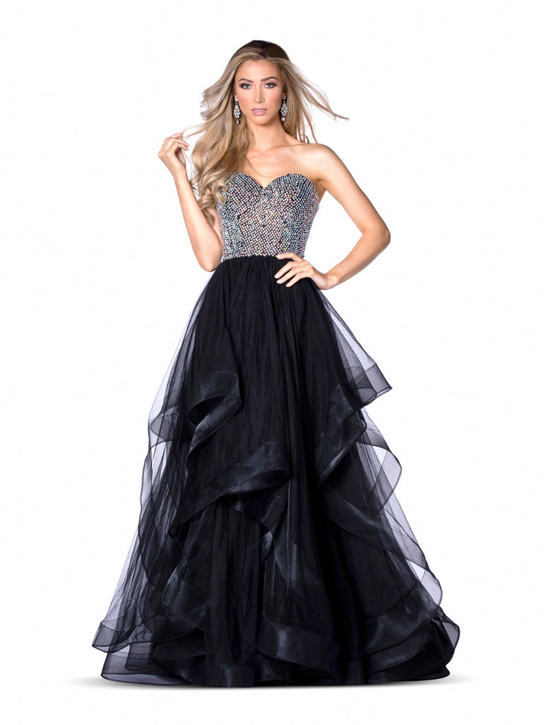 The bodice of this strapless Vienna Prom gown is adorned with crystalsand features a layered ballgown skirt, so you'll definitely dazzle the night away!