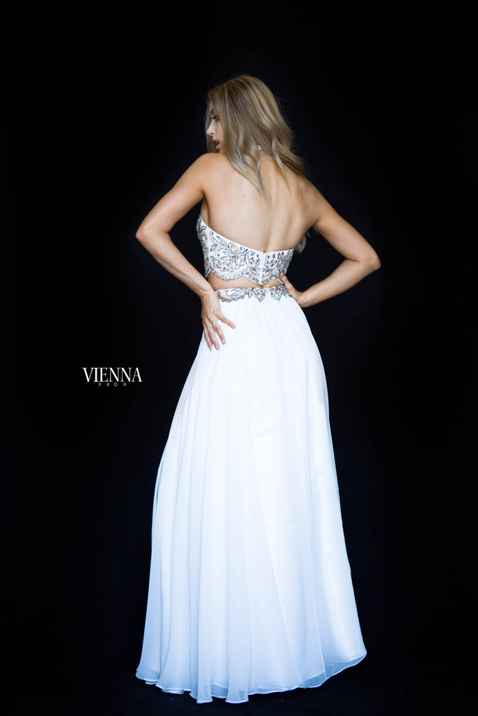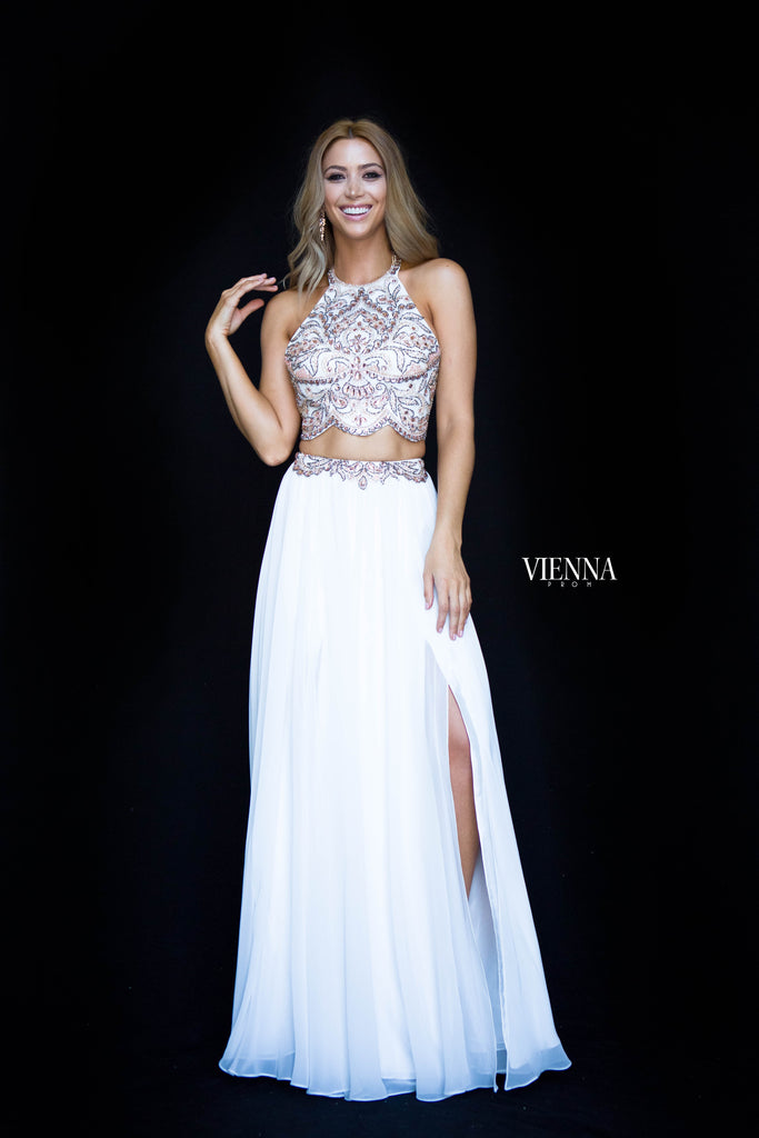 This two piece is perfect for prom and summer events! A crystalised halterneck top paired with a floaty skirt with waist detailing. Gorgeous!